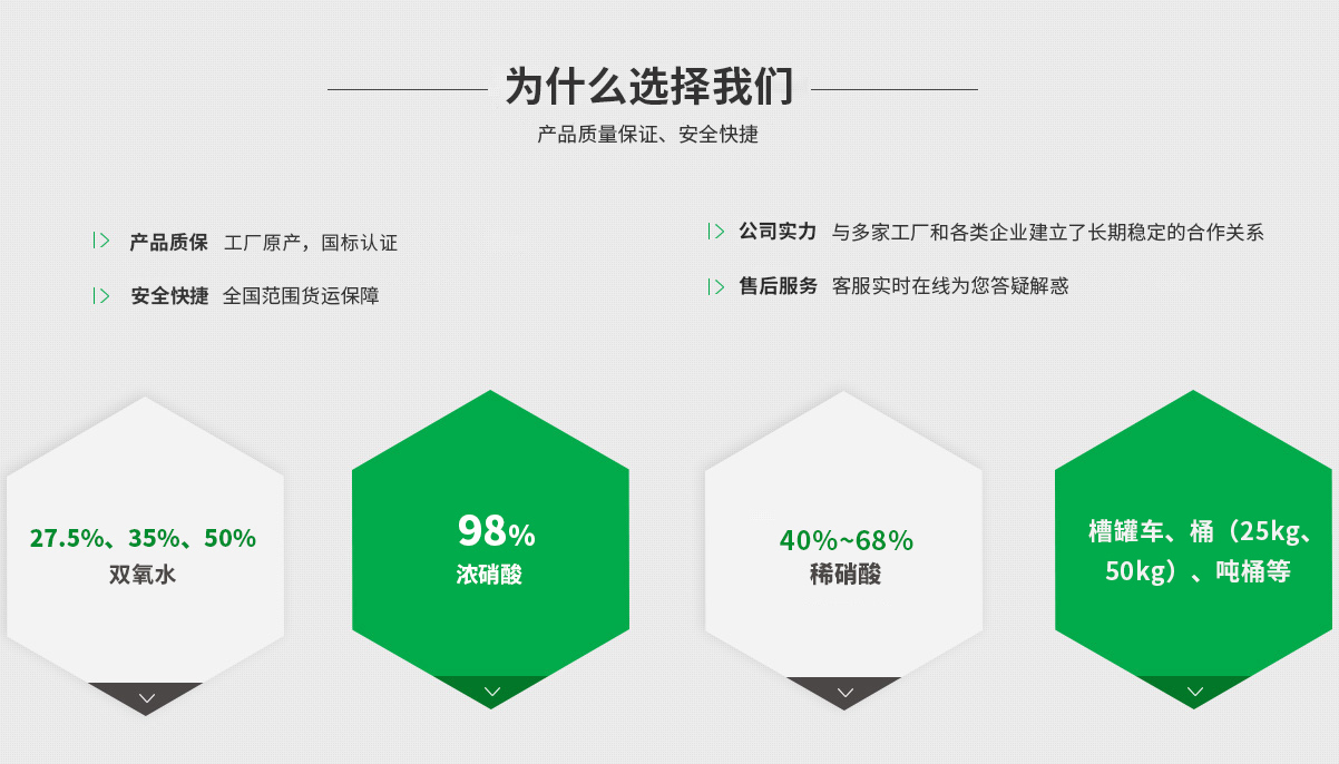 安徽安德諾化工產(chǎn)品銷(xiāo)售有限公司:位于合肥市蜀山區(qū),交通便利,主要經(jīng)營(yíng)雙氧水(27.5%、35%、50%)、濃硝酸(98%)、稀硝酸(40%~68%)等化工產(chǎn)品,與多家工廠和各類(lèi)企業(yè)建立了長(zhǎng)期穩(wěn)定的合作關(guān)系。公司產(chǎn)品齊全,實(shí)力雄厚,重信用、守...